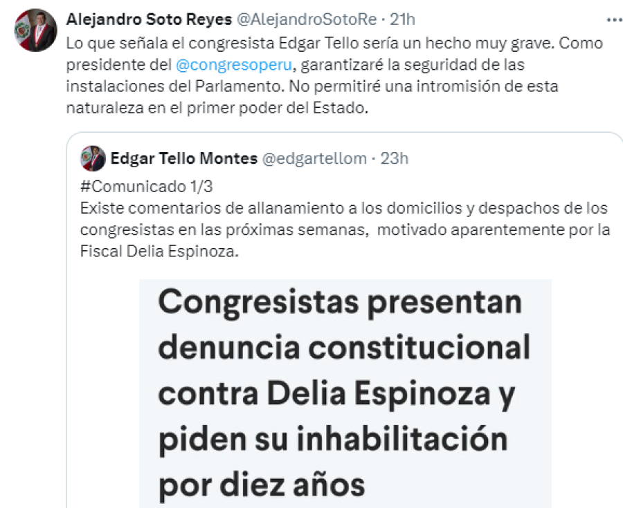 Ello, en respuesta a una publicación del parlamentario Edgar Tello, quien sostuvo que las diligencias mencionadas se darán “en las próximas semanas, motivado aparentemente por la fiscal Delia Espinoza”.